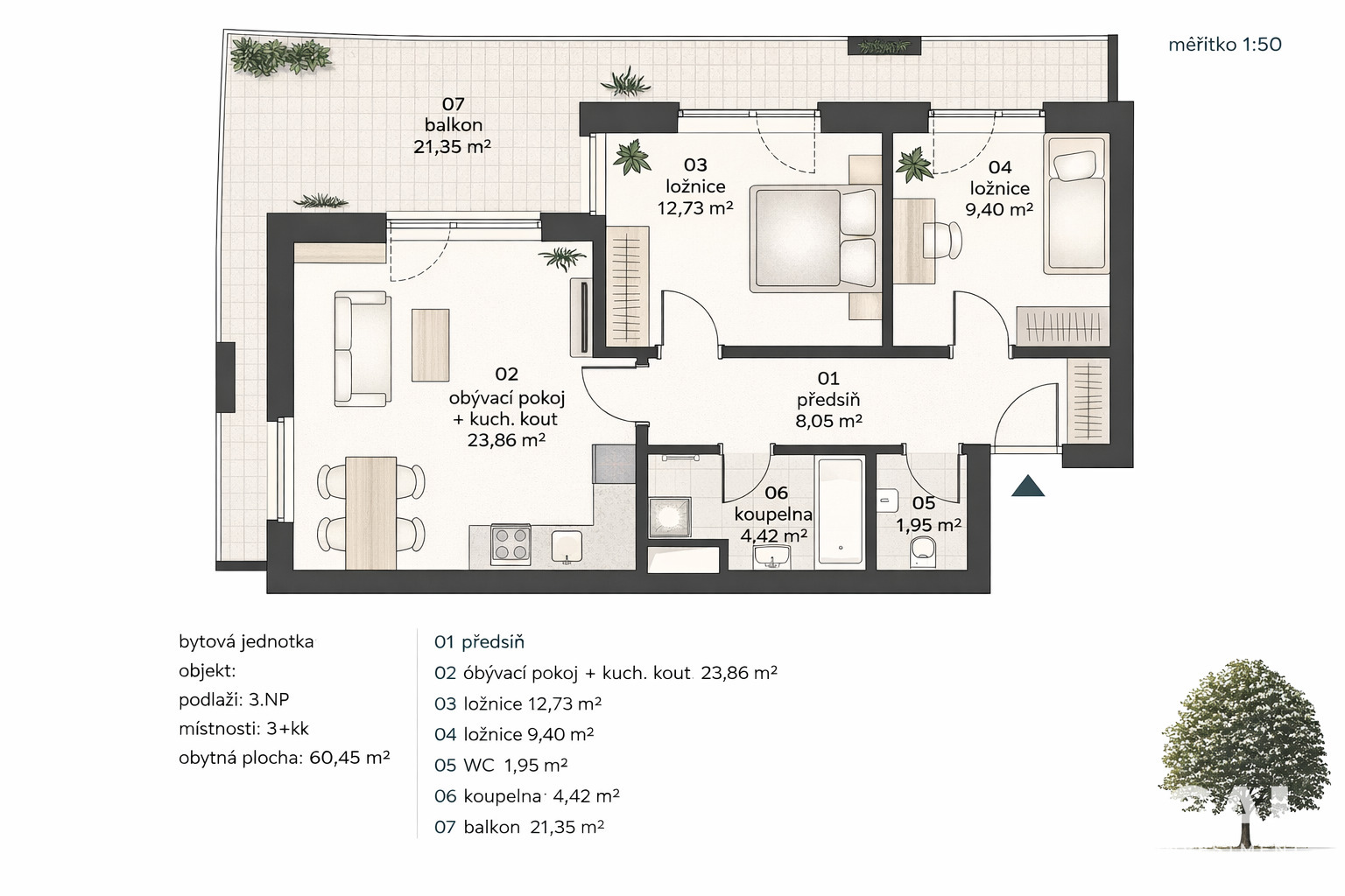 We offer to rent a beautiful, fully furnished apartment 3+kk in Prague 10 Malešice. Apartment of 61 m2 with terrace, cellar and parking space in underground garages is part of the residential project "apartments Malešice", in the Street Nad užlabinou. Malešice is one of the most sought-after locations in Prague, where full civic amenities are combined with housing within easy reach of nature. In the area of this new building there is a playground, the surrounding area offers walking and sports activities, shops, schools, kindergartens, post office, park, Polyclinic, restaurants, cafes - everything a family needs to live. The apartment is located in 3. floor and consists of 3 separate rooms: bright living room with kitchenette and 2 cozy bedrooms. All rooms have large French windows and access to the terrace (21 m2). The spacious bathroom with bathtub has plenty of space for lockers and a washing machine. The toilet is separate, with its own sink. The kitchen is equipped with a fridge-freezer, ceramic hob, microwave and extractor hood. The windows of the apartment are oriented to a quiet courtyard. There is a security door in the apartment. The apartment has a cellar (3 m2). Excellent transport links with the centre of Prague: Metro Station Želivského is 15 minutes on foot, or 5 minutes by bus. Fees for common household services are CZK 5,800 per month. Energy and internet deposits are taken by the tenant. The apartment is available from 16.3.2026. We recommend a tour!